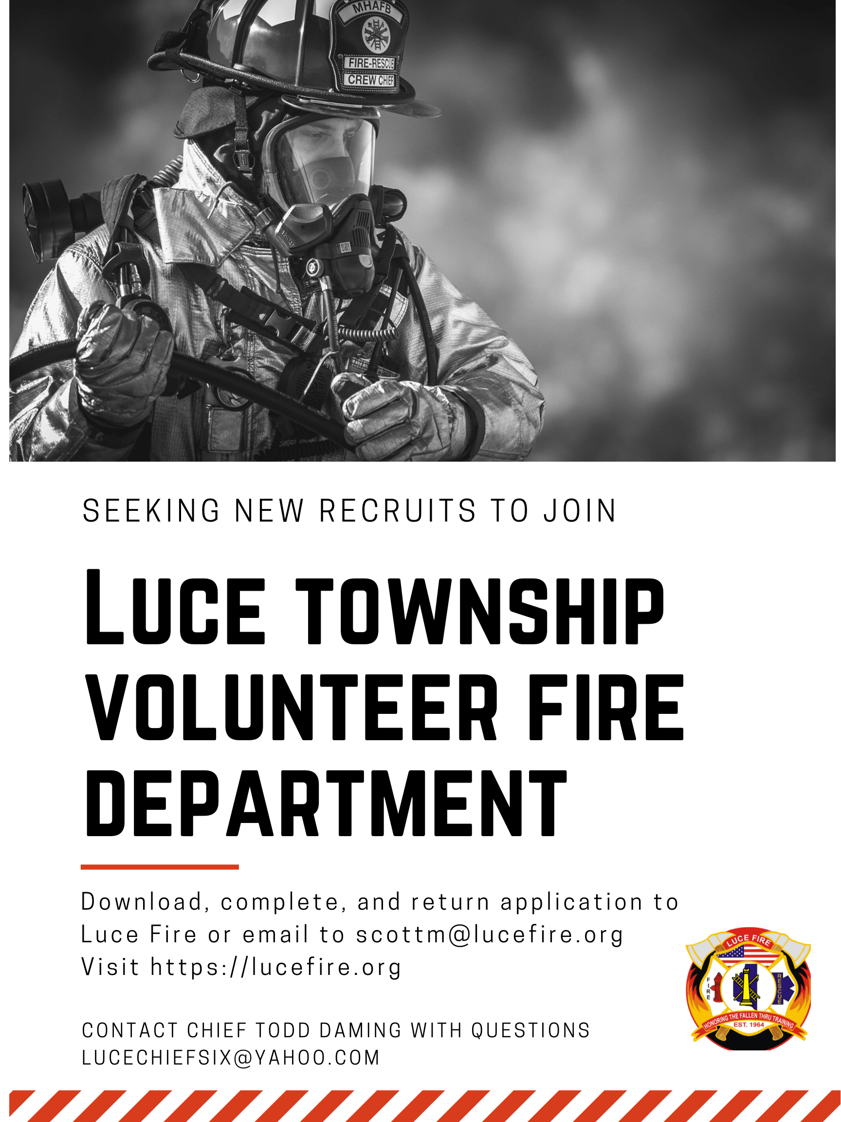 Our fire department depends on volunteers to keep our community safe. Luce Fire does not employ any full or part time firefighters. Whether you are interested in fires, medical, or just driving our impressive trucks, we can find a job for you. We only need your willingness to show up and we will provide everything else.
